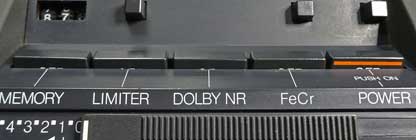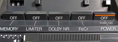 カウンターの下には、横一列に四角い押しボタンが並んでいる。 左から、カウンターメモリー、録音リミッター、ドルビー、フェリクロムテープ、電源をそれぞれON、OFFするスイッチで、上から下に押し込むようになっている。 これらのスイッチは、押し込まれていない状態が「OFF」で、その状態ではスイッチに書かれた「OFF」の表示が見えるようになっているが、押し下げてON状態にすると表示が隠れるようになっている。 ちょっとした工夫だが、スイッチのストロークも大きいため、ON、OFFの状態が一目で分かる。特に、一番右にある電源スイッチはオレンジのラインが引いてあり、さらに状態が分かりやすくなっている。 |