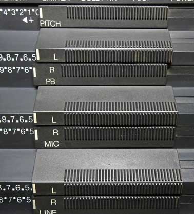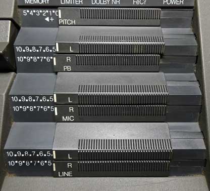 各種スイッチの下には、4種類7本のスライドボリュームが階段状に並んでいる。 上から、ピッチコントロール、再生出力(左右)、マイク入力(左右)、ライン入力(左右)の各ボリュームで、ボリュームを動かすスライダーも階段状の本体と一体になるようデザインされている。 これだけの数のスライドボリュームが並んでいるのはカセットデッキでは珍しく、しかも、階段状に並んでいるところが本製品のデザインを特徴付けているポイントになっていると思う。 |