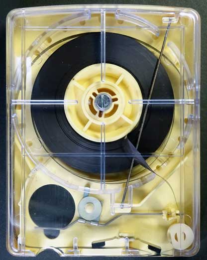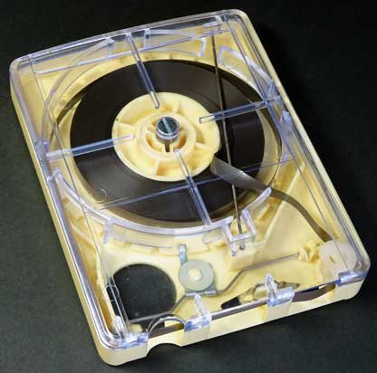 同じエンドレステープ式の8トラックカートリッジとよく似ているが、ピンチローラーは内蔵されておらず、「ピンチローラ導入孔」が8トラックカートリッジのピンチローラーのある位置に開いている。 ローディング方法は8トラックカートリッジと同様で、カートリッジのテープ面をプレーヤー(デッキ)の挿入口に差し込む。 |