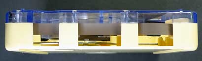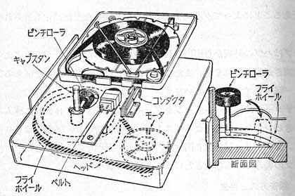 プレーヤー側に装備されたピンチローラーは、カートリッジ装着の邪魔にならないよう横倒しになっているが、カートリッジが押し込まれると「ピンチローラ導入孔」の部分で起き上がり、テープをキャプスタンに押しつける。 |