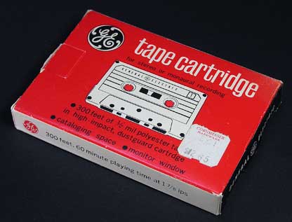 GE(General Electric Company)は世界最大級のアメリカの複合企業で、発明王トーマス・エジソンが設立した会社をルーツとして100年以上の歴史を持つ企業である。 名前のとおり、電気機器を製造するメーカーであったが、ジェットエンジンやディーゼル機関車などの大型機械、金融、メディア、宇宙開発までを手がける企業となっている。(日本でいえば、東芝や三菱のようなものか) 本製品は、カセット初期に家電メーカーとしてのGEブランドで発売されたものである。 コンパクトカセット規格のテープなのだが、まだカセットテープという名称になじみがなかった時代だったせいか、「Compact Cassette」のロゴや表示が全くない。 パッケージの記載によると、カセット本体は日本製となっており、TDK製だったという情報がある。 |