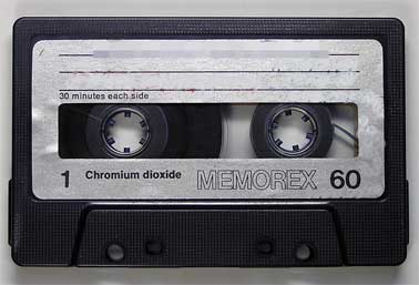 青いテープはリーダーテープである。 中心のヘッドブロックが収まる部分には、ヘッドを包み込むような「湯舟型5面磁気シールド」がはめ込まれており、写真では下部にも金属があるのが分かる。(通常のカセットのシールドは、ヘッドパッドの裏側のみ。) また、ヘッドパッドは他社のカセットに比べてかなり大きい。 |
