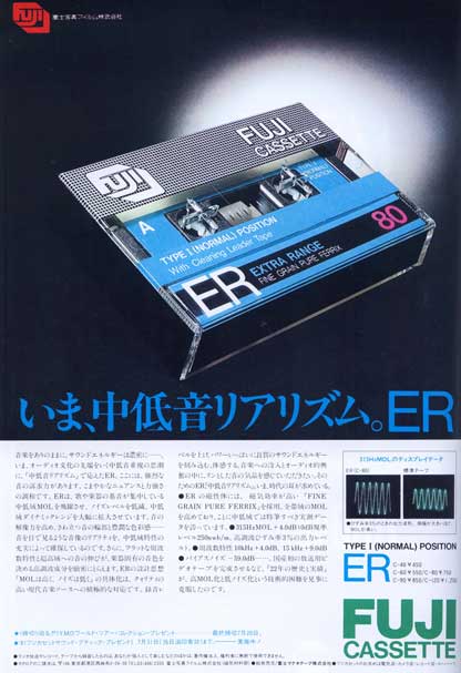富士フイルムのLHタイプのカセットで、「(Range)-4」の後継にあたる製品である。 1980年、同社はカセットのラインナップを一新したが、その際にフェリクローム相当の高価格帯にあった高性能ノーマルテープ「(Range)-6」は整理され、ノーマルタイプは本製品と「DR」の2品種となった。 「ER」は「EXTRA RANGE」の略で、磁性体には「(Range)-4」と同様に「FINE GRAIN PURE FERRIX」が使用されている。 「粒子サイズ0.35μm、針状比1/8〜1/10の超微粒子で、かつ、磁気効率の非常に高い新磁性体が、均一に塗布され、スムーズな磁性塗膜面を形成、従来のカセットにない“静寂のノイズレベル”を実現しています。」(当時の広告から。) カセットの本体にはシリーズ共通の高精度ハーフや精密ローラーが使用され、内部のシートは帯電防止効果やクッション効果にすぐれたエンボスシートを採用することで安定したテープ走行特性を確保している。 パッケージのデザインは、(Range)シリーズに較べるとかなり落ち着いたものに変わり、同一デザインで製品のグレード別に色分けする方式となった。「ER」の製品カラーにはライトブルーが採用された。 プラスチックケースは全ての部分が透明なタイプに変わり、包装も透明なセロハンからデザインが印刷されたシュリンクとなった。 |