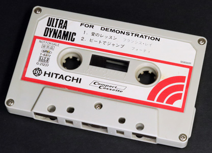 日立のテレコ又はカセットデッキの付属品と思われるデモテープである。 使われているテープは一般品ではなく、LHタイプの「ULTRA DYNAMIC(UD)」となっている。 カセット本体ラベルのデザインは、当時の「UD」とほぼ同じだが、ハーフはブラックではなく、LNタイプのカセットと同様な灰白色のものが使われている。 A面に試聴用の音楽が2曲入っており、B面はブランク(録音可)となっている。 |