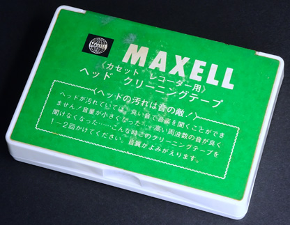 マクセルの初期のヘッドクリーニング用カセットである。 中のテープは、ポリエステルフィルムの表面に微小粒子の研磨剤を塗布した白色半透明のタイプである。 カセット本体には、録再ヘッド部分だけではなく消去ヘッドがあたる部分にもパッドが内蔵されており、それぞれのヘッドにクリーニングテープを押しつけるようにできている。 カセットを裏返しで使うと消去ヘッドにパッドが当たらなくなるため、カセット本体の裏面ラベルに「裏面で使っても効果がない」との注意書きがある。(なお、間違えて裏返しにローディングしてもキャプスタンがパッドに引っ掛かることはない。) プラケースは上蓋を大きく開けるタイプのものが使われている。 マクセルが「maxell」ではなく「MAXELL」だった頃の製品で、当時使われていた地球マークも懐かしい。 |