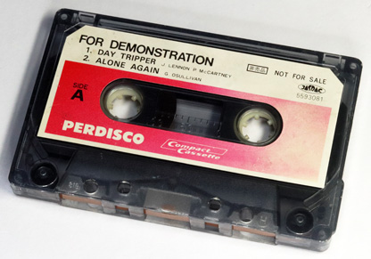 日立のラジオカセットレコーダーの付属品と思われるデモテープである。 「PERDISCO」(パディスコ)というのは当時の日立のラジカセに付けられていたネーミングである。 A面には、女性の声による短いアナウンスの後、試聴用の音楽(インストゥルメンタル)が2曲入っており、最後にヘッドクリーニングや電池の消耗チェックの必要性などについてのアナウンスが録音されている。 B面は録音用としてブランクになっている。 |