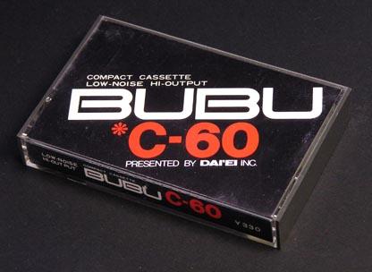 ダイエーが「BUBU」という当時のプライベートブランドで販売していたLHタイプのカセットである。 「BUBU」は当時のダイエーが主に家電商品に使っていたブランドで、メーカー品に較べて安価な価格設定がされていた。 当時、各メーカーのLHタイプC-60の定価が550円程度だったのに対し、本製品は定価330円とかなり廉価に設定されていた。(もっとも、BUBU製品の定価=実売価格なので、実売価格での差はやや縮まる。) パッケージのデザインはシンプルで「LOW-NOISE」とほぼ同じだが、ベース色がブラックになっているため、若干の高級感が出ている。 しかし、カセット本体の方は、ハーフもラベルも「LOW-NOISE」と見た目はほとんど変わらず「HIGH-OUTPUT」の表示が追加されているだけという、下位製品とほとんど差別化されていないデザインとなっている。 また、「LOW-NOISE」も同様だが、BUBUのカセットは、パッケージに大きく「C-60」と書かれてる文字はオレンジのカラー印刷となっているにもかかわらず、カセット本体ラベルはグリーンで印刷されているため、使っているとちぐはぐな感じを受ける。 製造元は定かでないが、カセット本体ハーフの色は富士フイルムのLHタイプ「FM」に似ている。 |