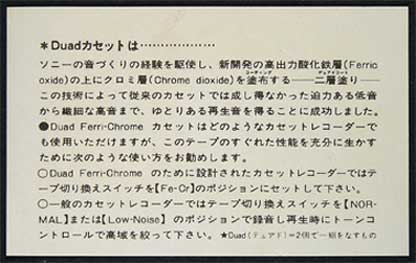 ケース内に入っていた製品説明カード。説明の冒頭からいきなり「ソニーの音づくり・・・」(CBS/SONYではなく)となっているところが面白い。 (画像ではカセットケースよりカードの方が大きくなっていますが、これは文字が読めるように拡大したもので、カードの実際の大きさは、約 5cm×8cmです。) |