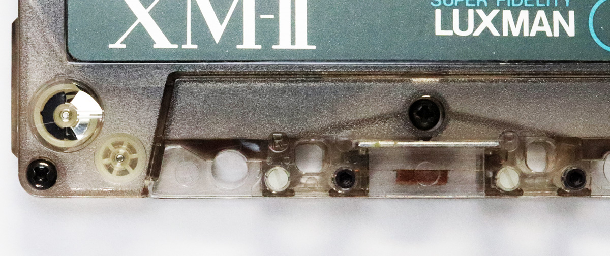 一番左のやや大きいガイドローラーが「テープ走行時間検出用ガイドローラー」で、一部が白く見えているのはテープ走行時間を光学的に検出できるよう縞模様の反射板が付いているためである。このローラーはテープが1秒分走行すると2回転するように設計されており、ラックス社の一部のカセットデッキで使用すると早送りや巻き戻しの際にも正確にカウントができるようになっていた。 また、ヘッドブロックが入る部分の両側にある小さいネジが「スキュー調整機構」で、左の白いネジが録音用の調整ネジで、右の白いネジは再生用である。 なお、白いネジの右にある黒いネジは、反対面用の固定側。 |