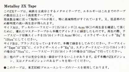 ナカミチの試聴用デモンストレーションメタルテープである。 A面に音楽、B面はブランクという通常のデモテープの形式であるが、A面の音楽はカセット規格の1/2のスピード(約2.4p/s)で録音されているという特殊なテープである。 これは、ハーフスピードでの録再もできる同社のカセットデッキ「680(ZX)」の附属品として製作されたもので、説明によると、ミュージックテープ製造機でプリントしたものではなく、マスターテープの音源を個々の製品で録音して附属品にしていたらしく、かなりマニアックなものである。 ベースのテープはメタルタイプの「ZX」を使っているものの、スピードが半分になるとさすがに高域特性は厳しくなるようで、イコライザ設定はメタルやハイポジ用の70μsではなく、ノーマルテープ用の120μsが使われている。 「680」はハーフスピードでもFM放送のエアチェックには充分な10〜15kHzの周波数特性(ZXテープ使用時)でワウフラ0.08%以下を確保しており、このデモテープも半速とは思えない堂々とした音で再生させる。 |