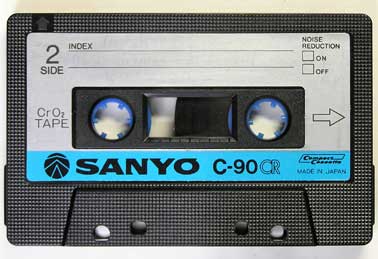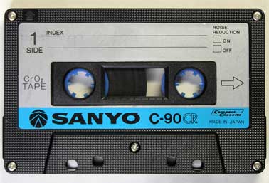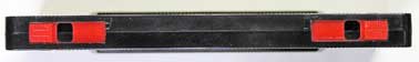 再録音防止タブ部分の赤いカバーを閉めた(両面とも録音可の)状態 カバー中央の黒い部分は、クロムテープとしてデッキが自動認識できるように開けてある穴 |