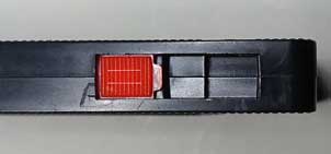 赤いカバーを左へスライドした(録音不可)状態 クロムテープ認識用のホールが露わになる位置までスライドする仕組み |
