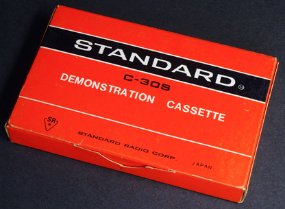 スタンダード工業(後の「日本マランツ」)のデモンストレーション・カセットで、同社が製造販売したカセットテープレコーダーの付属品と思われる。 スタンダード工業は、その前身である「スタンダード無線工業」(1953年創業)時代からラジオやテレコを製造販売しており、記録によると、国産のカセットテレコが各社から発売され始めた1966年、SONYや日本コロムビアなどよりも先にカセットテープレコーダーの発売を開始している。 本製品は比較的初期の製品に付属していたものと思われる。 パッケージは紙製で、パッケージを半周するほど大きいフタが付いているタイプである。 |