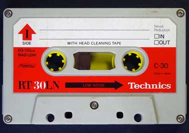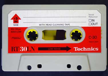 テープ残量確認窓は独特の形をしている。ハブの色はテープ残量が視認しやすいよう黄色になっている。 確認窓の下にあるテープの残量目盛りは、一番左の位置で残り約4分(C-60の場合)になるように付けられている。 |