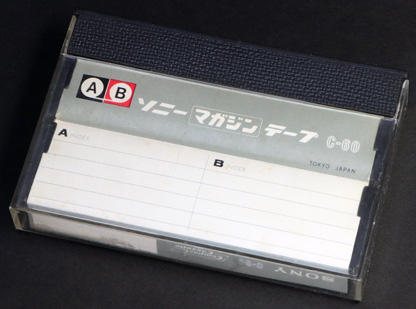 ソニーが1960年代に販売していたカセットテープ「マガジンテープ」の初期のモデルである。 1970年頃まで、ソニーはカセットテープのことを「マガジンテープ」と呼んでおり、同社のカセットテープレコーダーを「マガジンマチック」という愛称で宣伝していた。 本製品は、その初期に販売されていたもので、独特のプラケースに入っている。 このプラケースは外側の透明な容器の中にカセットを載せた黒いトレイを差し込む方式で、トレイは中間で折れ曲がるようになっているので、途中まで引き出せばカセットが取り出せるようになっている。 また、カセット本体は、A面が白、B面は黒という異なる色のハーフが使われており、これは、その後のカセット全製品の中でも大変珍しい。 ケース内には「プレゼント・カード」が封入されており、これを6枚集めると専用のテープスタンドがもらえたようである。 |