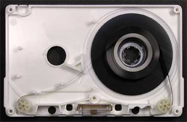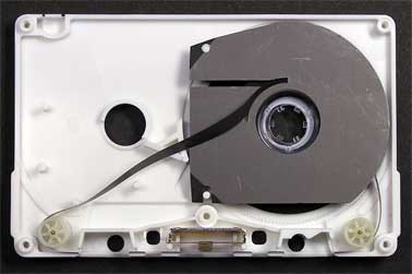 スリップシートを取り除いた状態。 右側リールの外側に巻き取られたテープは、リールの一番内側から取り出され、送り出されていくようになっている。 |