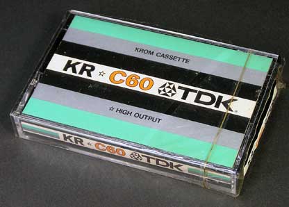 TDKのクロムテープである。 いわゆる「クロムタイプ」や「ハイポジ」などと称する製品とは異なり、磁性体に二酸化クロムを使用した「本物」のクロムテープである。 TDKカセットのフルモデルチェンジにより、ストライプのパッケージとなった。 製品タイプを表す基本色は薄緑及び銀色。 デザイン的には同社「SD」などと同柄の色違いではあるが、「D」「SD」が「ダイナミックシリーズ」と称していたのに対し、本製品は「ブリリアントシリーズ」として一線を画していた。 製品グレードを表す星印(「KR」と「C60」の間に表示されているもの)は白抜きの「☆」1つとなっており、ダイナミックシリーズが「★」の数で表しているのに対して、本製品は別格であることを示している。 「バイアス値が深いため、一般レコーダ、デッキにおすすめできませんが、高音の伸びがよく、クリアーな録音が必要なソースに絶好です。」(当時の広告から) 本製品の発売に相前後して、国内各メーカーやOEM供給を受けた各社からも次々とクロムテープが発売された。 しかし、1975年にクロムテープを凌駕する性能の「クロムタイプテープ」である「SA」の登場により、「KR」はこの製品が最終世代となった。 (bio様より未開封品を寄贈していただきました。) |