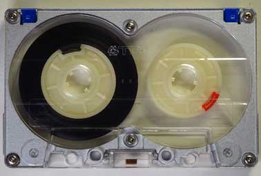 発売当時はメタル用のテープ種別検出孔の規格が定まっていなかったため、検出孔が全くない。(=ノーマルテープと同じ状態。) 青色は再録音防止用のタブの代わりとなるプラグ。 |