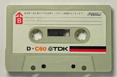 ラベルの上端に再録音防止爪の説明がある。 これにより、サイド表示「A」の上の矢印は単なるデザインではなく、その面の防止爪の位置を示していることが分かる。 |