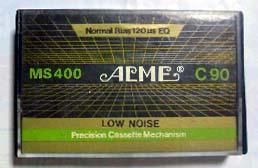1980年代頃に地元のディスカウントにて購入した香港製のオーディオテープです。当時一本60円〜100円の辺りで販売されておりました。 テープ自体の覗き窓は、中のフィルムでごまかされています。ケースは、BON等と同じタイプのもので、表紙には、MADE IN HONG KONG、LOW NOISE CASSETTE TAPEなど記載されています。 音は、BON等と同様、出力は低めで通常より高めに入れないとはっきりとした音が聞こえません。バブル時代に出回っていた香港製のオーディオテープです。 |