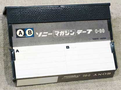 カセット本体については、SONYの初代マガジンテープと思われます。 このプラケースについては、画像を頂いて初めてこのような製品が存在していたことを知り、大変驚きました。 ケースのインデックスカードの記載が「C-90」になっているため(カセット本体はC-60)、異なる本体とケースを購入後に組み合わせたものと思われますが、インデックスカードの雰囲気から、本体と同世代の製品である可能性が高いと思います。 なお、SONYが初代マガジンテープ(C-60)を発売したのは1966年ですが、C-90を発売したのは1968年となっていますので、少なくともプラケースの方は1968年以降のものと思われます。 プラケースの透明部分にスレはありますが、全体的に保存状態も良く、なにより大変貴重な資料だと思います。 フリマは侮れませんね(笑)。 |